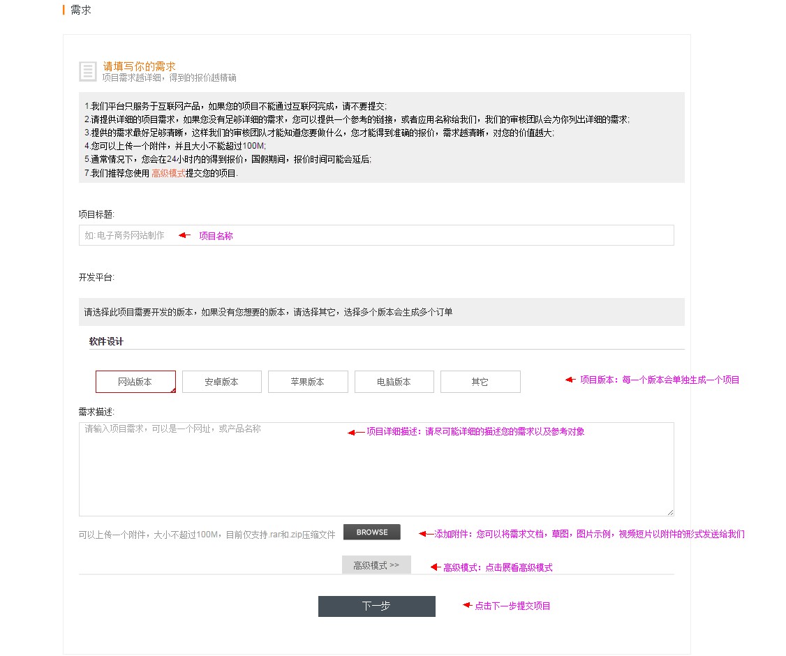 为了确保我们的技术团队准确的理解你的需求,请确保您提交项目时能够详细准确的描述您的需求,你可以向系统提供需求文档,图片描述,草图,视频短片,参考对象等说明信息。