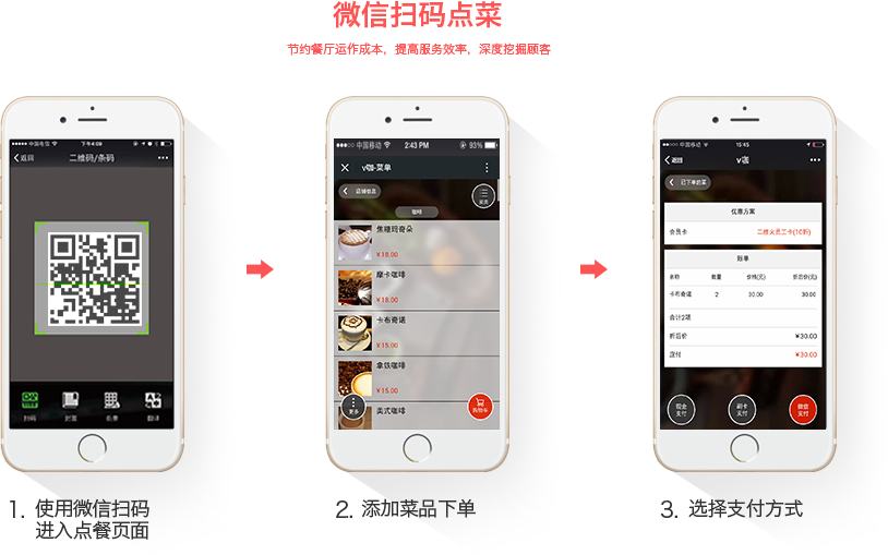 微信点餐支持手机结账,顾客用餐后可通过手机扫码进行支付,目前支持微信支付、现金、刷卡等多种支付方式