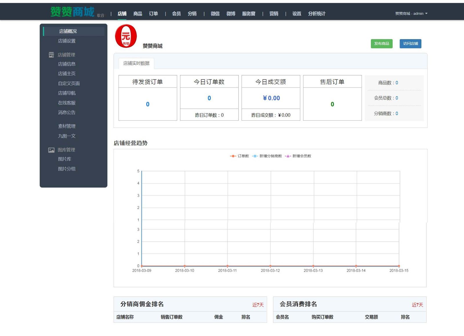 赞赞商城(ZZSHOP)是一款基于供应商二次开发的,基于微信公众号的一款轻量级H5商城系统。支持微信支付,支付宝支付,货到付款支付,线下支付等支付方式,支持模板定义选择,并支持嵌入到微信公众号之中销售,菜单也可以自定义,能够管理下级分销员,显示分销排行榜,数据统计,可以申请结算提现,运费模板设置。