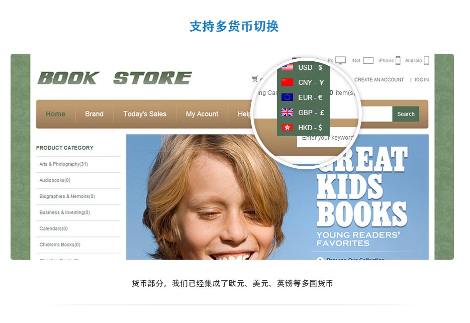 iShop4系列电子商务网站是由ishop4团队独立研发的一款产品。功能强大,操作简便,用户体验极佳。它将给你带来更多的客户和流量。客户可以很方便的搜索,添加到购物车,在线支付等等。在支付方面,我们集成了很多主流的付款方式,比如支付宝,paypal,西联等;在货币方面,我们集成了货币转换器,满足您跨境电商的需求。在语言方面,ishop4支持多语,再也不用担心国外客户看不懂网站啦。目前ishop4有5个版本,即pc版本,IOS APP,Android APP和Inet版本。可以极大的覆盖您的客户群。