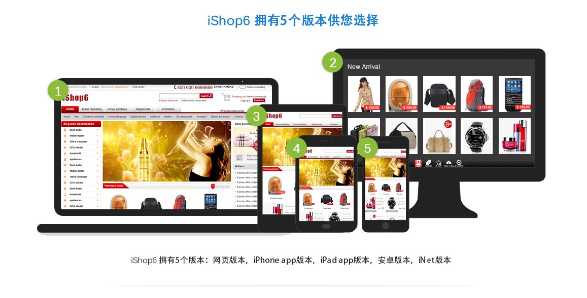 iShop6有5个版本,即电脑,安卓,ISO(iPad,iPhone) 和iNet 版本,能全方位覆盖您的客户群体。3.我能免费体验一下你们的电子商务网站吗?