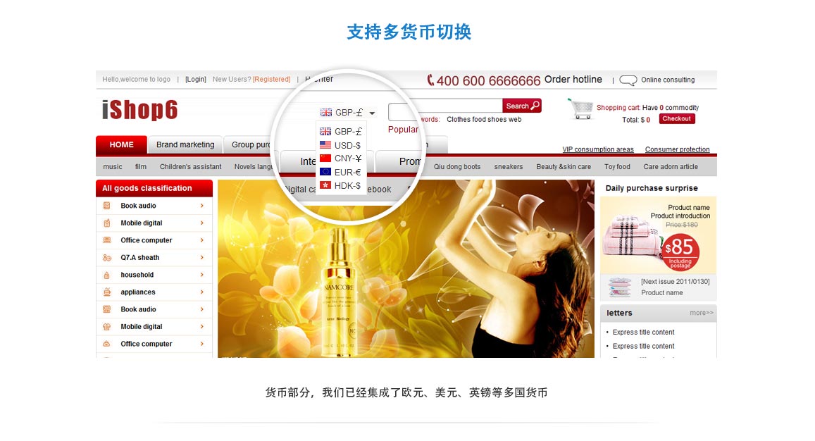 | iShop6系列电子商务网站是由ishop6团队独立研发的一款产品。功能强大,操作简便,用户体验极佳。它将给你带来更多的客户和流量。客户可以很方便的搜索,添加到购物车,在线支付等等。在支付方面,我们集成了很多主流的付款方式,比如支付宝,paypal,西联等;在货币方面,我们集成了货币转换器,满足您跨境电商的需求。在语言方面,ishop6支持多语,再也不用担心国外客户看不懂网站啦。目前ishop6有5个版本,即pc版本,IOS APP,Android APP和Inet版本。可以极大的覆盖您的客户群。 |