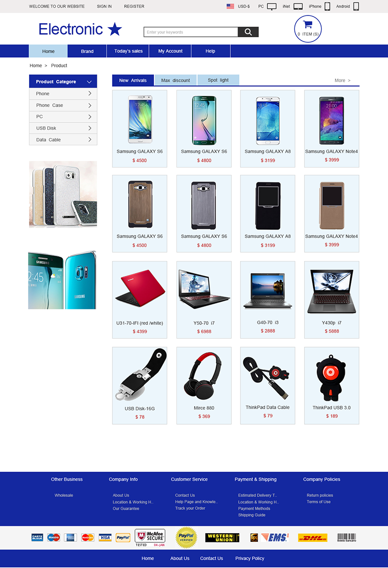 iShop4系列电子商务网站是由iShop4团队独立研发的一款产品,具有功能强大,操作简便,用户体验极佳的特点,它将会给您带来更多的客户和浏览量。在该网站中,您可以很方便的使用搜索、添加到购物车、在线支付等功能。在支付方面,我们集成了多种主流的付款方式,比如支付宝、paypal、西联等;在货币方面,我们集成了货币转换器,满足您作为跨境电商的需求;在语言方面,iShop4支持多种语言,再也不用担心国外客户看不懂网站啦。目前iShop4有5个版本,即网页版、iPhone app版、iPad app 版、安卓版、iNet,可以极大的覆盖您的客户群体。