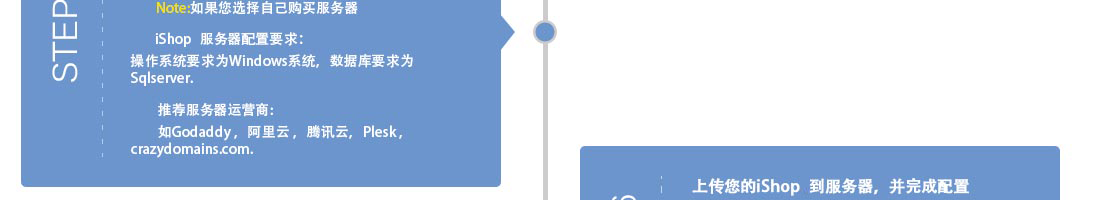 iShop系列产品只支持Windows系统,推荐使用系统Windows 2003,2008,2012,服务器提供商 万网云服务器 和 腾讯云服务器 以及国外的 Godaddy . CPU建议在2核以上,内存建议在4G以上,带宽大小10M以上,空间大小50G以上,你也可以购买云虚拟主机,数据库大多数购买服务器都会免费赠送,如果没有赠送,需单独购买数据库,数据库为SqlServer,版本建议在2005以上。