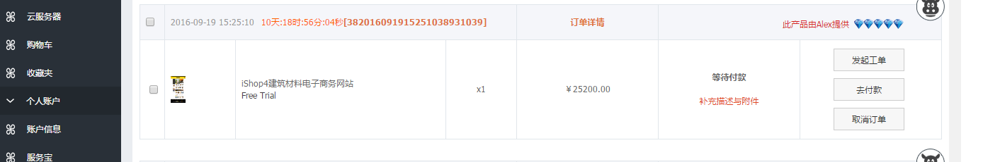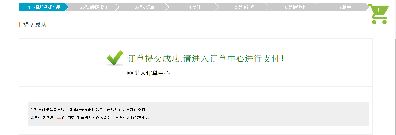 3.如果您选中的产品和服务需要评估,您可以通过发起工单与系统专家在线沟通。您也可以选择取消订单。