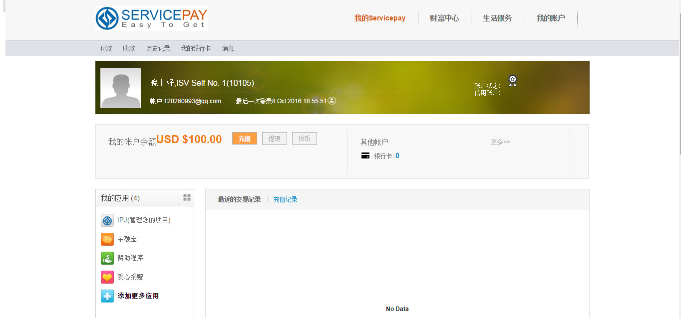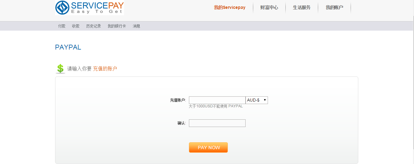 您也可以选择我们支持的其他充值方式。点击“我的Servicepay”>"充值"