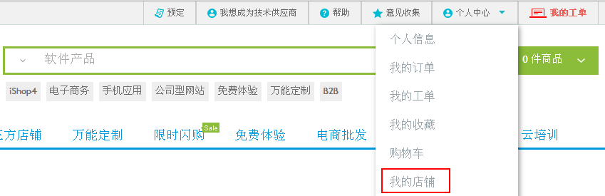 (1.)注册成为软谷会员后,点击我的账户下拉框,点击我的店铺