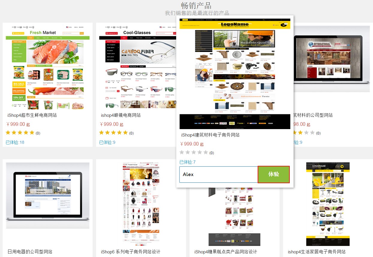 (3.)选择模版创建自己的网站,输入店铺名,“点击体验”