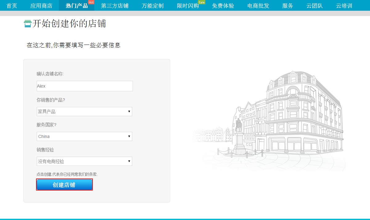(4.)填写一些必要信息,开始创建你的店铺,点击“创建店铺”