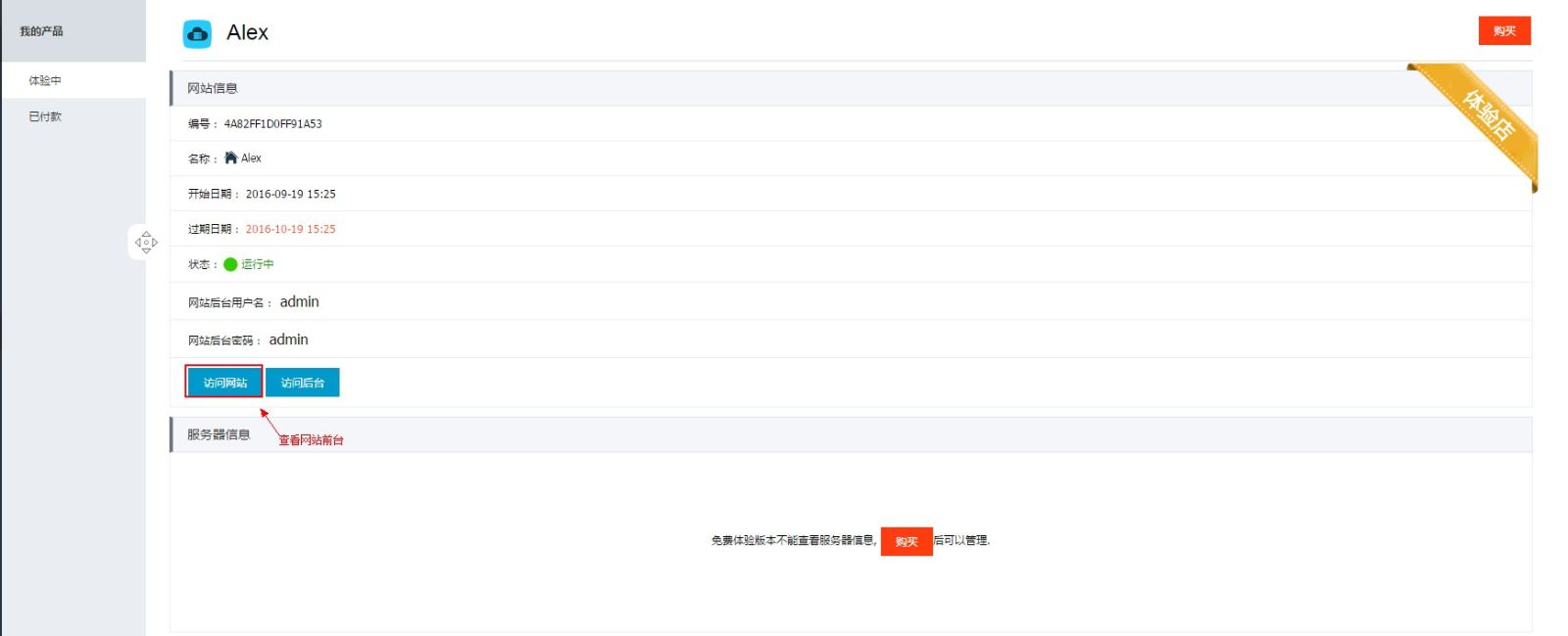 (5.)系统会创建您的体验产品,点击“访问网站”查看网站前台