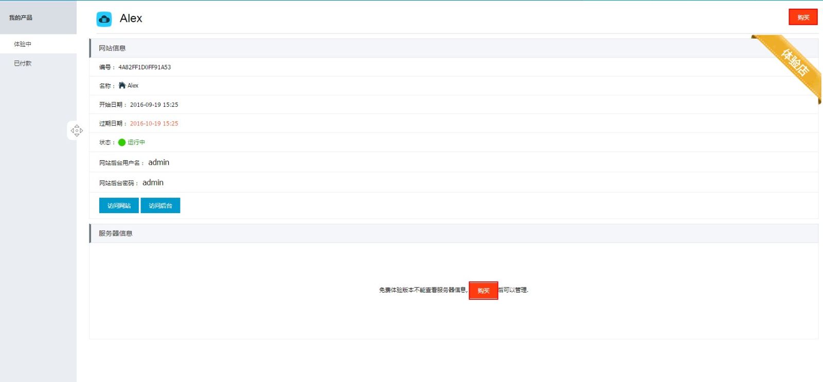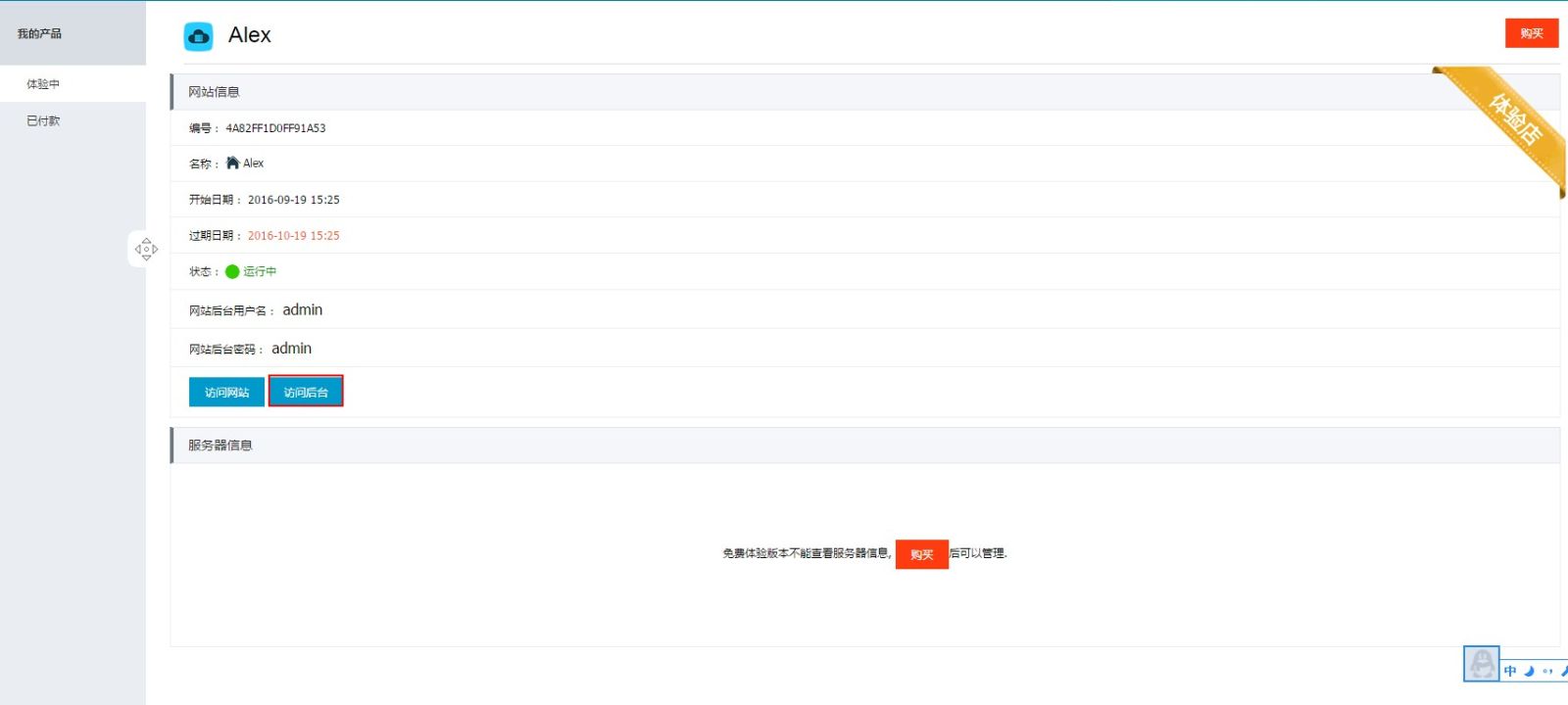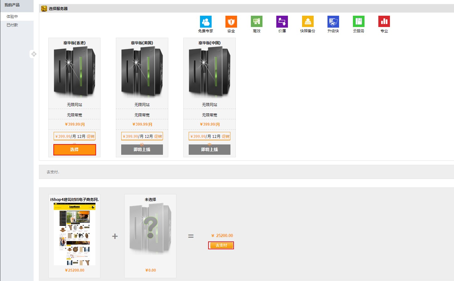 (7.)如果您对试用的网站感到满意,您可以点击“购买”,选择服务器及产品,点击“去支付”购买产品。